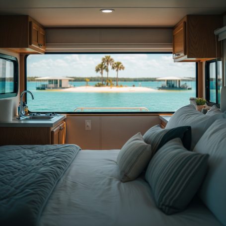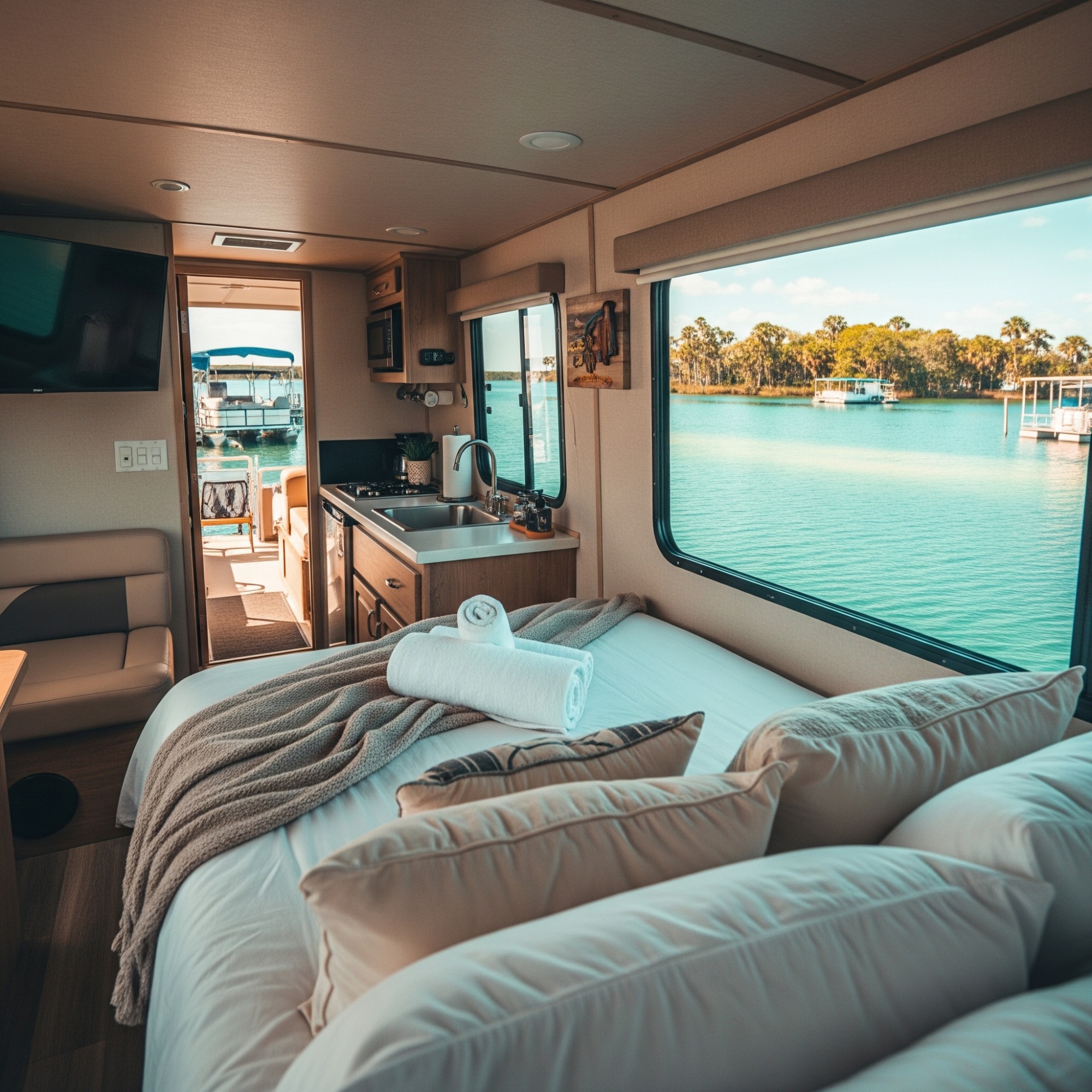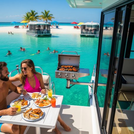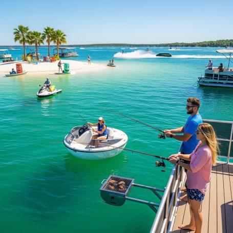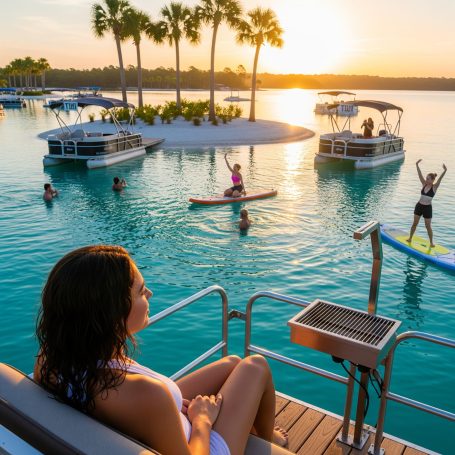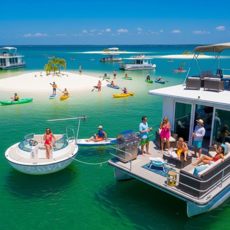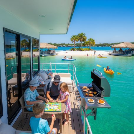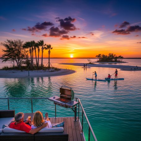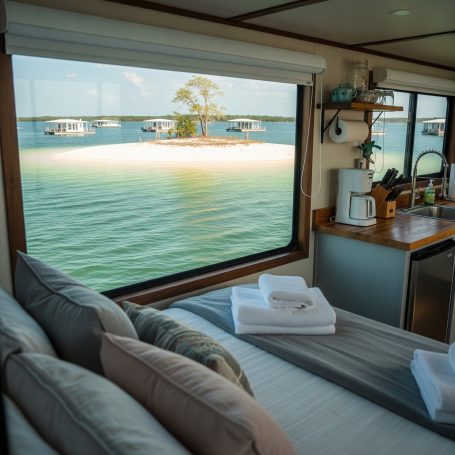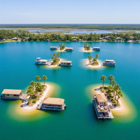 From the tranquil mornings on the deck of a Harbourtowne Hideaway Houseboat to the fiery hues of a Gulf Coast sunset, each conceptual image showcases the unparalleled beauty that awaits. Witness guests actively enjoying the crystal-clear turquoise waters, whether swimming, paddleboarding, or cruising on a 24ft pontoon boat. See the seamless blend of luxurious interiors opening onto expansive decks, and the distinctive architecture of our overwater bungalows.