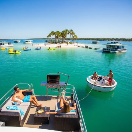 Each houseboat is a stationary pontoon boat anchored to a private island on a 300-acre spring-fed lake. Guests will be able to get to and from shore via a provided Go-Boat or their own vessel.